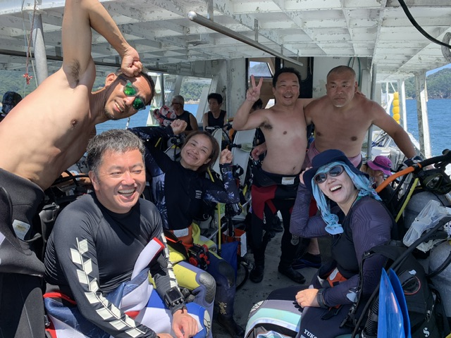 今回参加いてくれたメンバーは今年のGWにダイブマスター集中コースに参加してくれたうっちーのぶさんみはしちゃん3名と長年僕の担当で続けてくれてるダイブマスターのともちゃんとパパ。そして僕と一緒に神子元4回目のキヨちゃん。信頼できるゲストのみなさんと神子元に潜れてガイドさせて頂きとても幸せでした。
